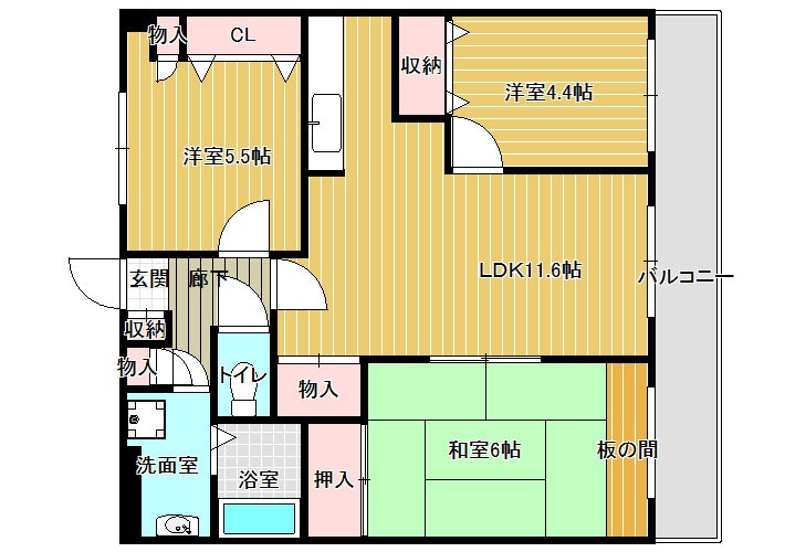 南向きバルコニーで日当たり良好です。洋室、和室、リビングが南向きです。