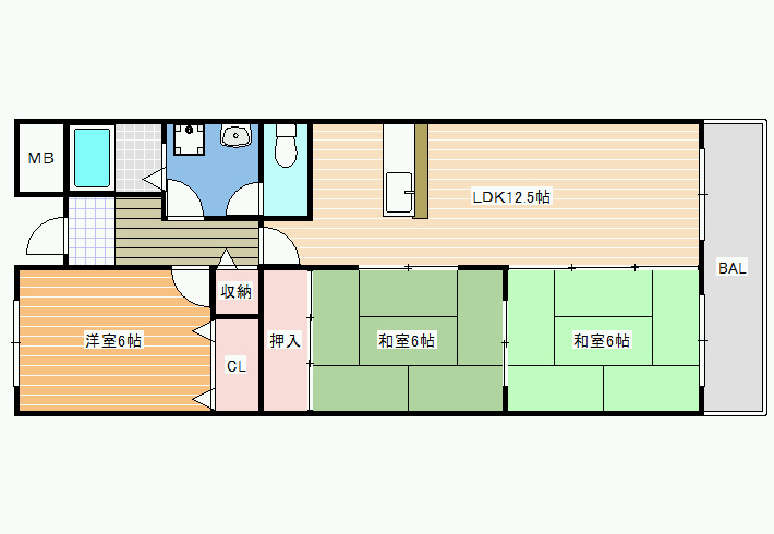広々12帖のLDKと6帖のお部屋が3つのファミリータイプ物件です。