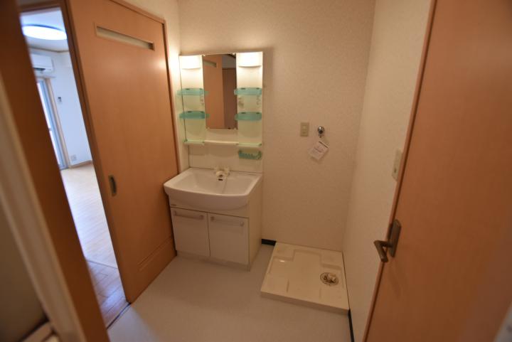 洗面台別、室内洗濯機置き場あり。大阪教育大学、関西福祉科学大学の学生さんの